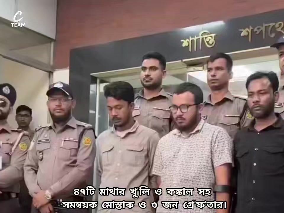 title: '80K views · 396 reactions | ৪৭টি মাথার খু'লি ও কঙ্কাল সহ সমন্বয়ক মোস্তাক ও ৩ জন গ্রে'ফ'তার। পুলিশ হত্যার বিচারের কথা শোনার পর পর এই খুলি উদ্ধার হয়, বিভিন্ন শ্রেণি পেশার মানুষ মন্তব্য করছেন জুলাই আগস্ট জঙ্গি হামলায় যে পুলিশ নিহত হয়েছিল তাদেরই খুলি এবং কঙ্কাল হতে পারে। | CTeam'