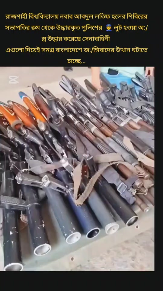 | content | রাজশাহী বিশ্ববিদ্যালয় নবাব আবদুল লতিফ হলের শিবিরের সভাপতির রুম থেকে উদ্ধারকৃত পুলিশের 👮 লুট হওয়া অ:/স্ত্র উদ্ধার করেছে সেনাবাহিনী এগুলো দিয়েই সমগ্র বাংলাদেশে জ:/ঙ্গিবাদের উত্থান ঘটাতে চাচ্ছে...#tiktok #bangladesh🇧🇩 #tiktok #fur #you |